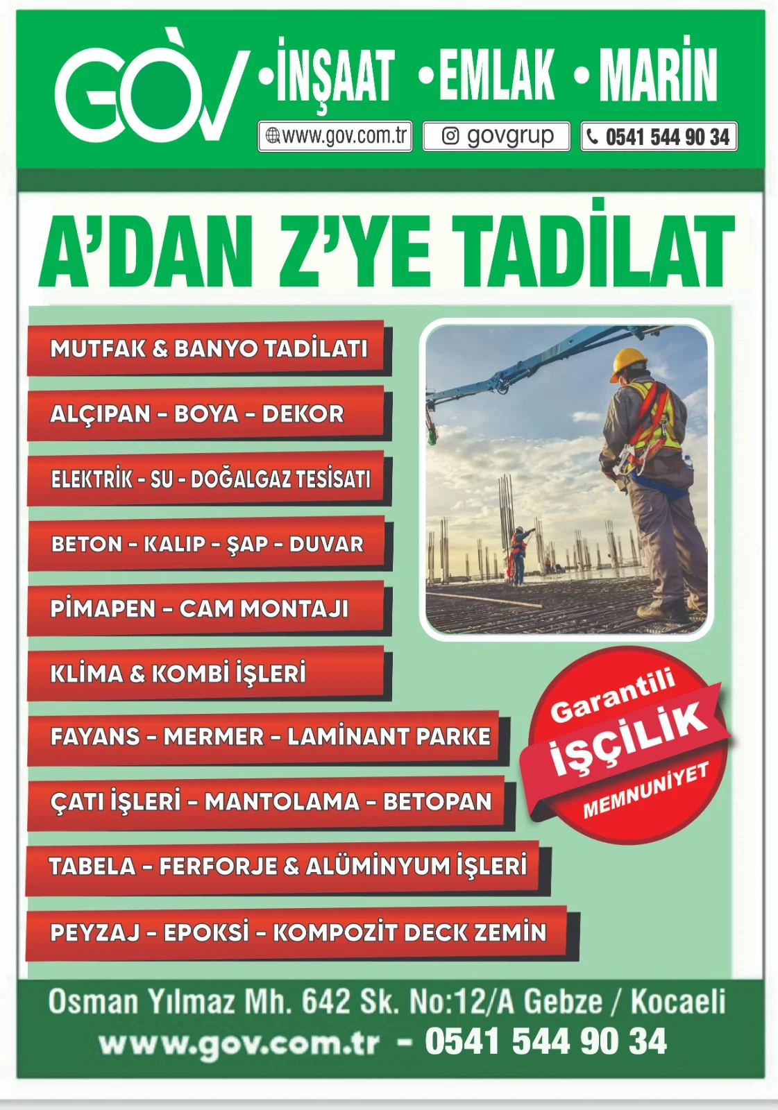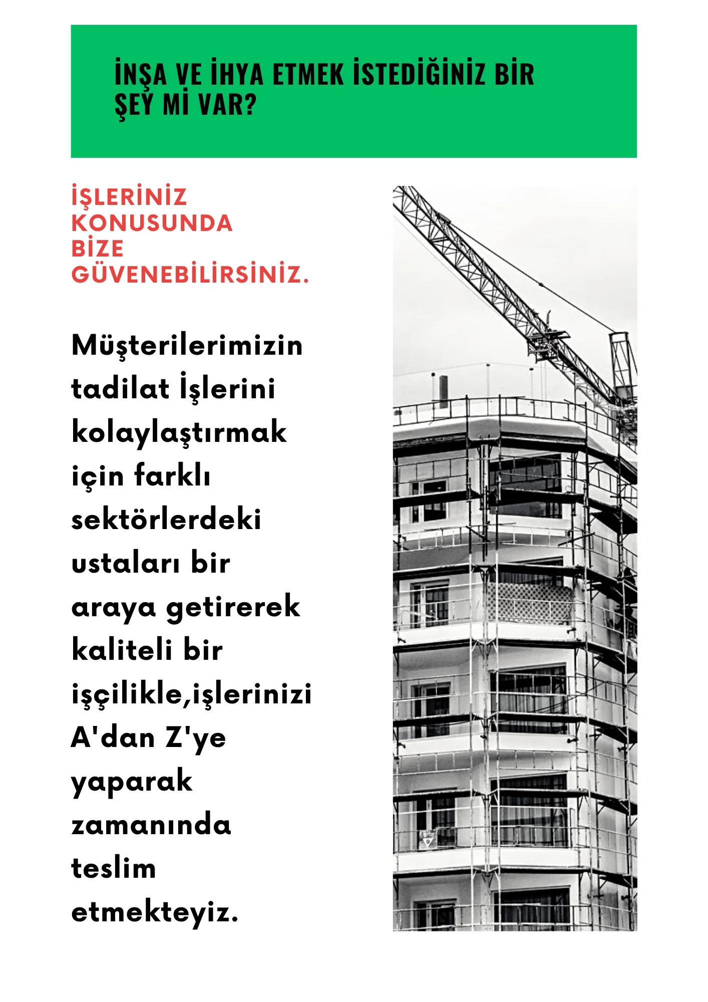 A'dan Z'ye Tadilat servisi olarak,müşterilerimizin bütün işlerini tek elden hallediyoruz. Farklı sektörlerdeki ustaları tek çatı altında toplayarak işleri kolaylaştırdık. İşleriniz için farklı firmalar ve ustalar arama derdine son. Doğru adrestesiniz.Size en yakın çözümü sunmak için buradayız!